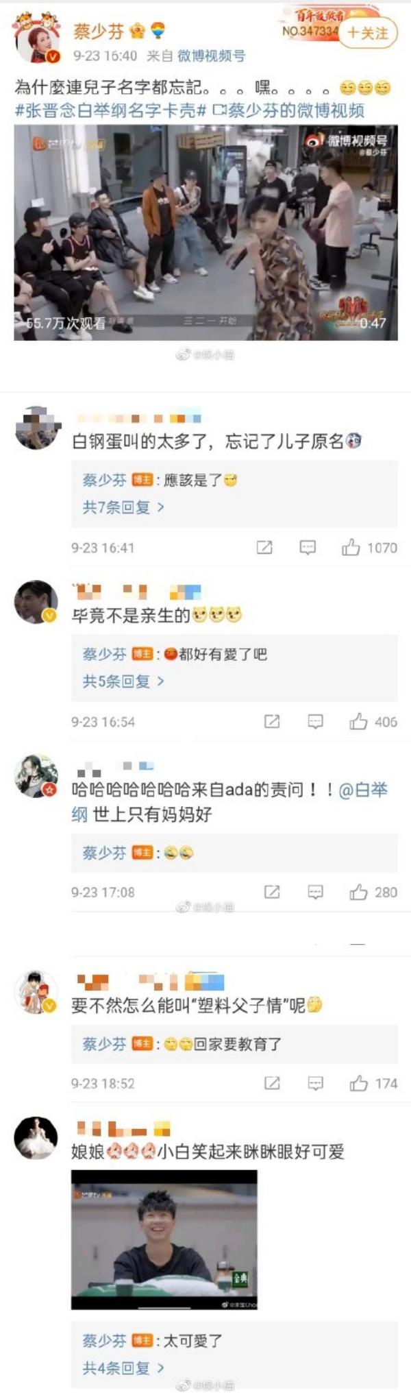 蔡少芬还提及节目中的两个儿子——白举纲、高瀚宇,感谢他们激发出性格沉稳的张晋的可爱面。她曾转发张晋念白举纲名字卡壳的视频,责问:“为什么连儿子名字都忘记?”,还夸白举纲太可爱了!