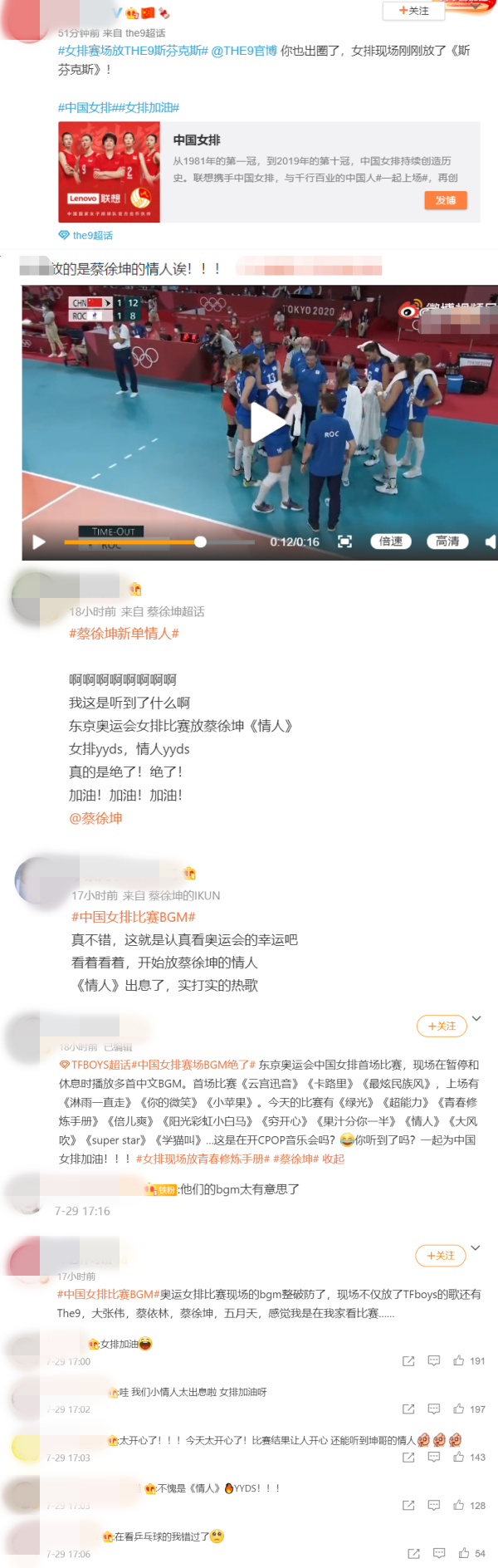 在29日,东京奥运进行的女子排球比赛上,有网友注意到中国女排比赛期间,现场播放的BGM除了有蔡徐坤的《情人》之外,还有TFBOYS、THE9等热门歌曲。