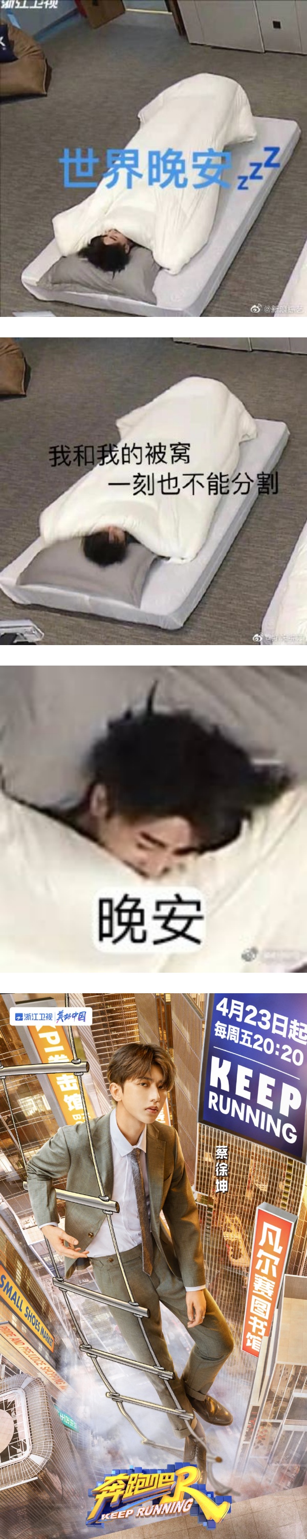 曝光的动图看到,蔡徐坤穿着印上名字的团服,从画面外直飞到被窝,而且还瞬间盖上被子入睡。该动图流传后,网友为蔡徐坤制作成不同版本的梗图。