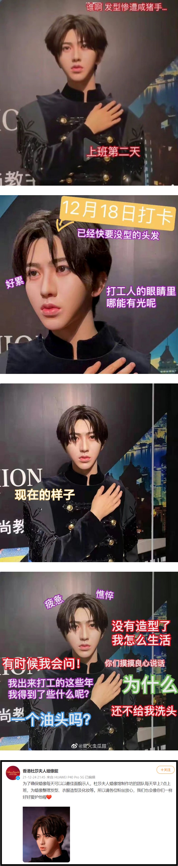 香港杜莎夫人蜡像馆随后也发文回应,表示团队每天早上都会为蜡像整理发型、衣服造型及化妆等,“所以请各位粉丝放心,我们也会像你们一样好好爱护他喔”。