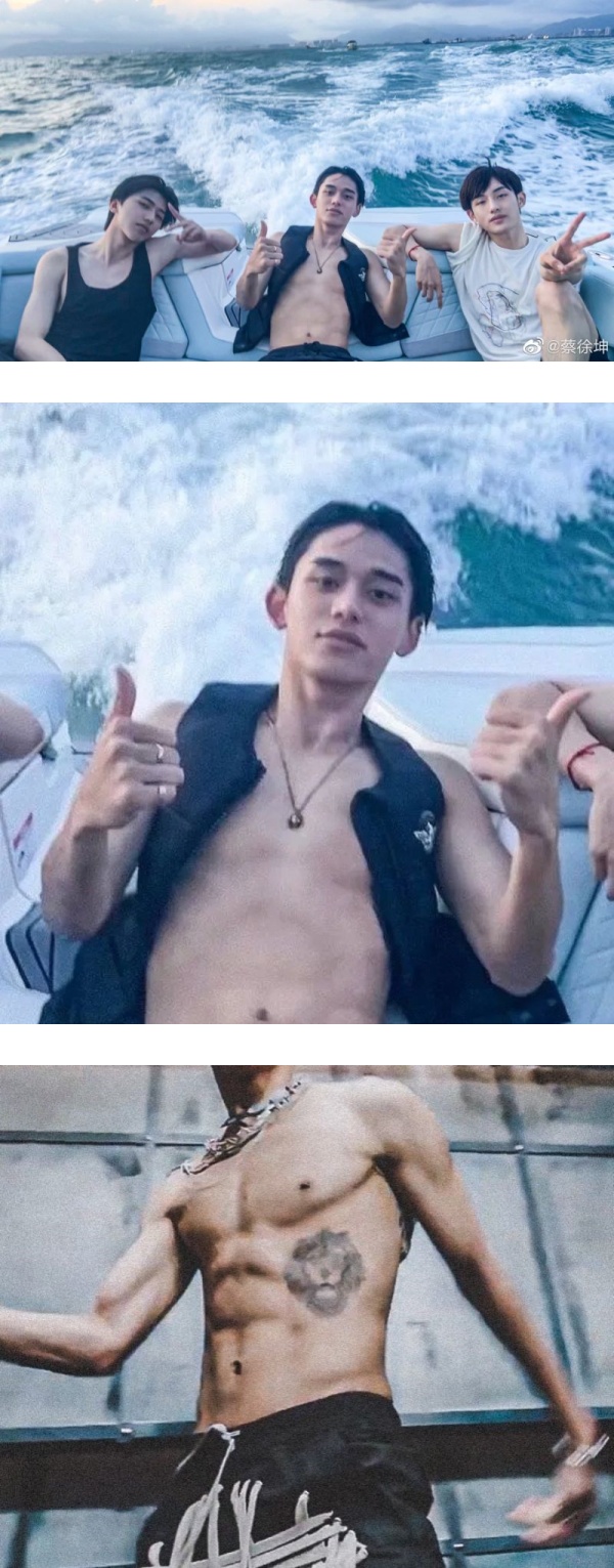 蔡徐坤上传一张和Lucas、董思成靠在船边的合照,当中C位Lucas的穿着最性感,他只披了一件夹克入镜,大方露出腹肌。