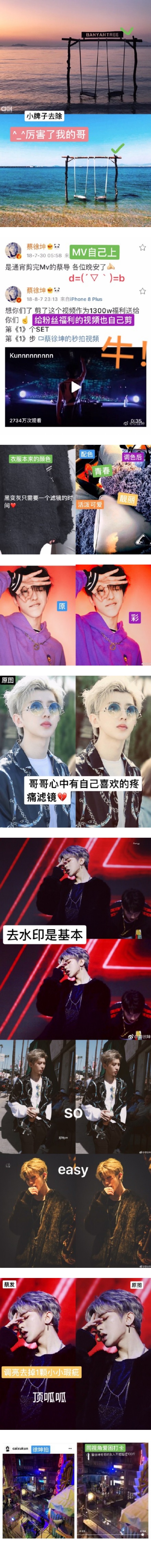 另外,网友也晒出蔡徐坤过去的一系列P图成果,当中有为照片调色、P走脸上的痣,甚至拿饭拍图也会记得去除站姐的水印!一起来看看,蔡大神的作品吧~