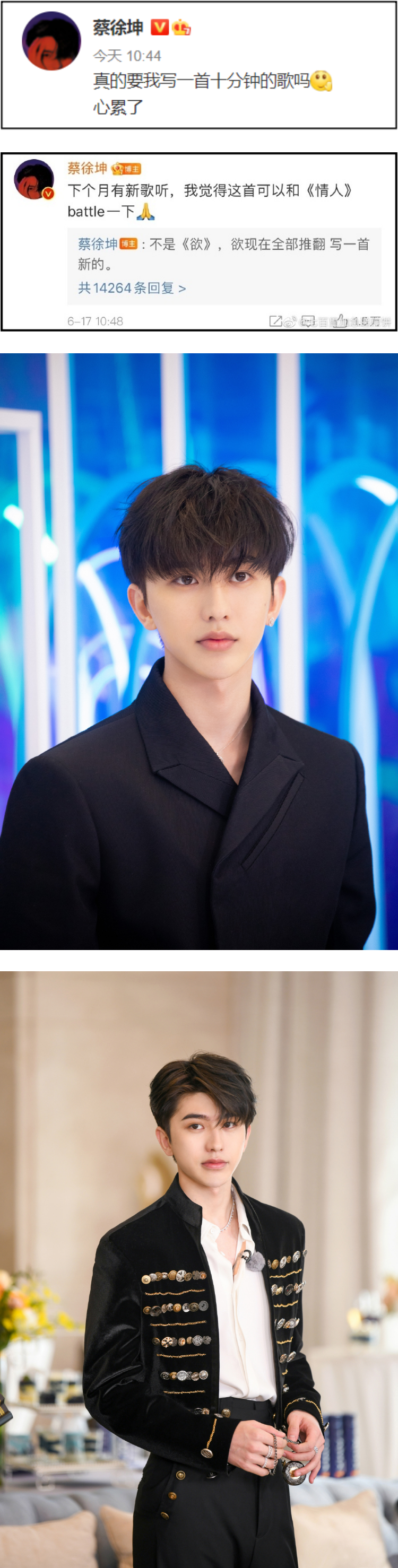 5G冲浪的蔡徐坤今天(17日)在微博发文,调侃:“真的要我写一首十分钟的歌吗?心累了”,并在留言区惊喜自爆:“下个月有新歌听,我觉得这首可以和《情人》battle一下”、“不是《欲》,欲现在全部推翻,写一首新的。”
