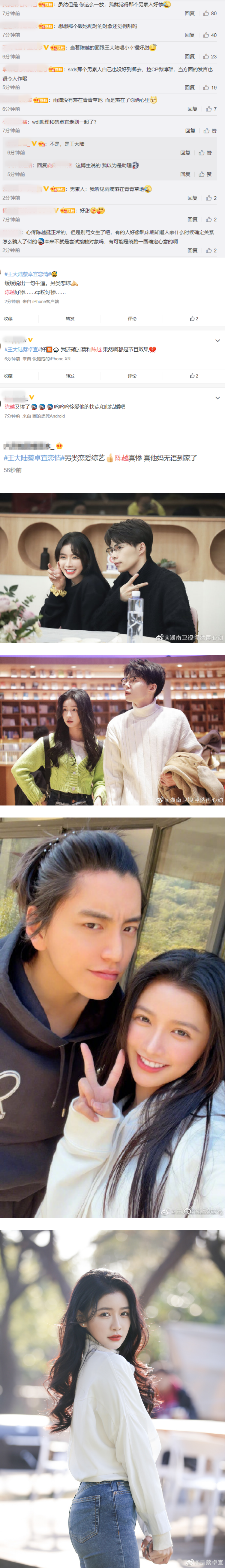 然而时隔几个月,蔡卓宜却被拍到与王大陆激情拥吻,且男方当时还是节目中的征爱助理,因此让不少网友傻眼吐槽,纷纷心疼陈越:“感觉就像个工具人”、“只想说跟蔡交往的男嘉宾惨”、“陈越好惨,cp粉好惨”、“求陈越的心里阴影面积”、“觉得那个男素人好惨”、“我真的以为她是因为事业才拒绝那位男素人,因为他俩相处的很好,现在搞这一出,我滤镜真全碎了”、“陈越那么优秀的男的,真的不值得,让他们圈里的人好好鬼混吧”。