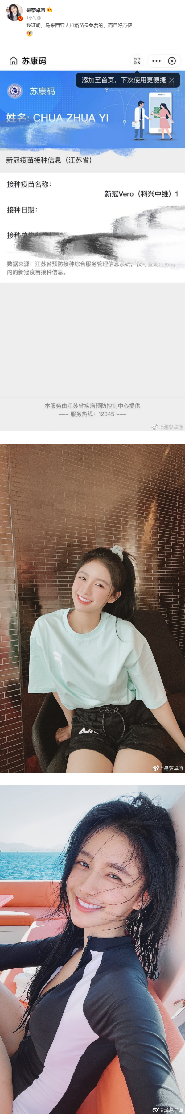 蔡卓宜发布了一张,接种科兴疫苗的图片配文,“我证明,马来西亚人打疫苗是免费的,而且好方便”。