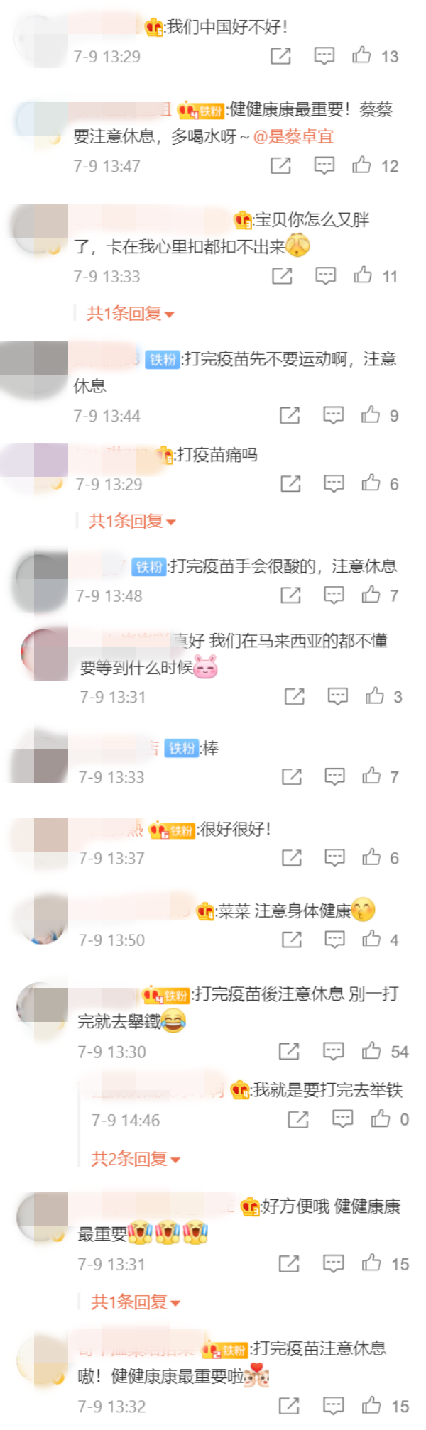 贴文曝光后,网友留言要她照顾好自己,“打完疫苗后注意休息 别一打完就去举铁”、“好方便哦 健康最重要”、“宝贝多喝水”、“注意休息”等,有者则感叹说,“真好 我们马来西亚的都不懂要等到什么时候”。
