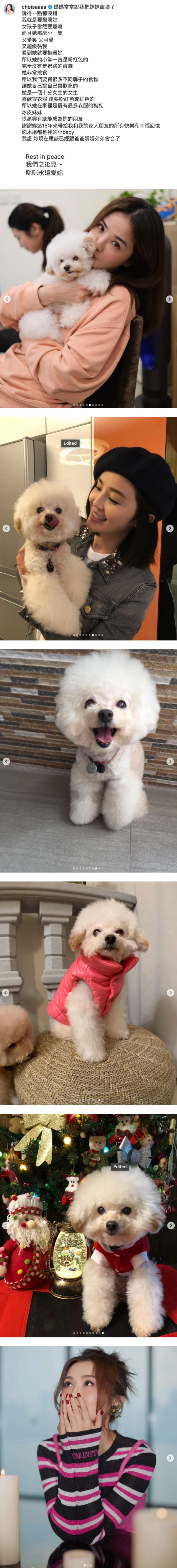 香港女星蔡卓妍(阿Sa) 是百分百的狗奴,自小家中就养有多只贵妇狗,不过去年4月份连续痛失2爱犬“碌柚”及“荔枝仔”后,2022年再度失去15岁的“妹妹”冰皮,让她发文缅怀。