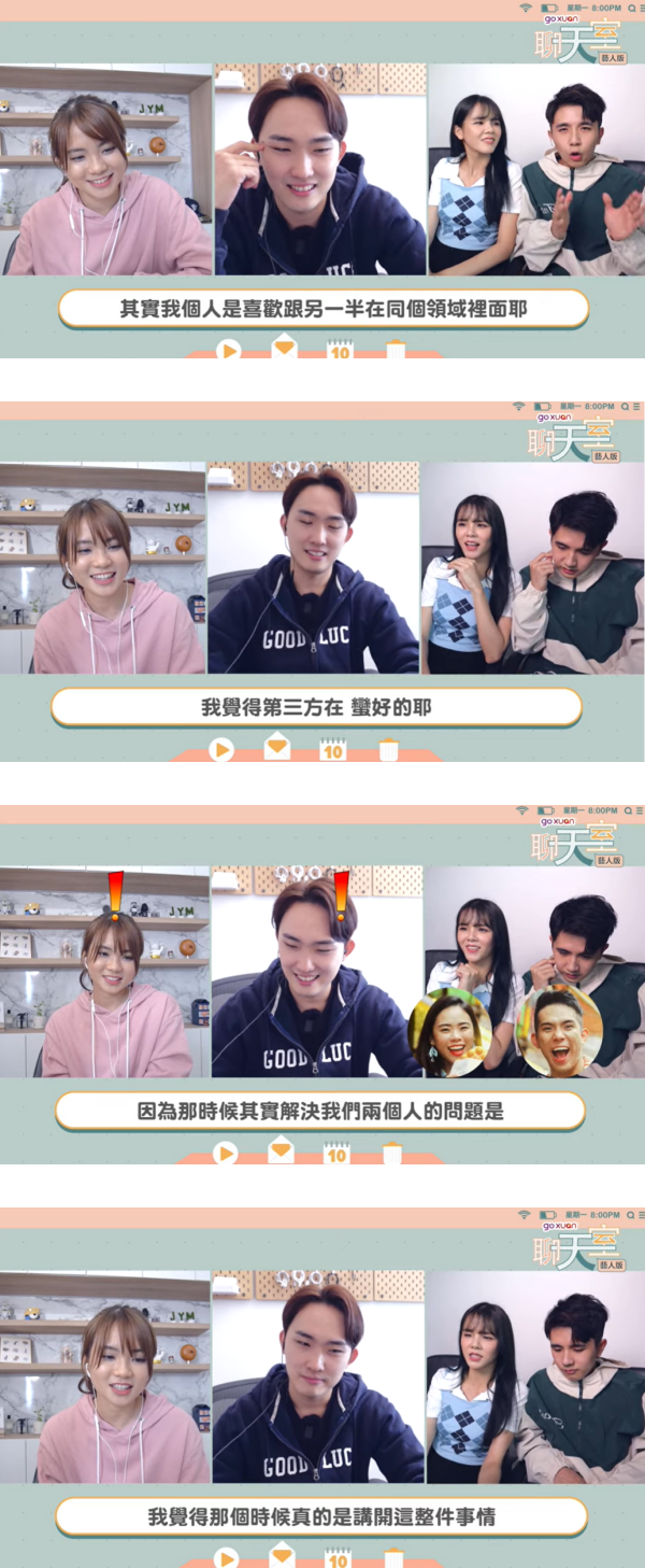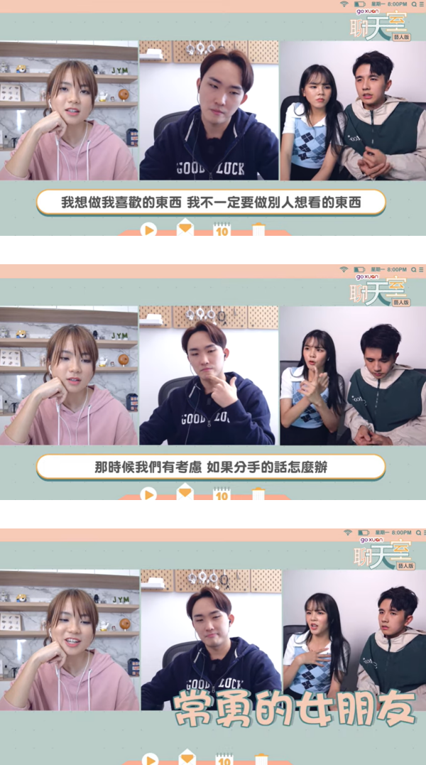 Joe说,对网络创作者而言,许多情侣都会开设情侣YouTube频道,而且反应也不错,常勇和舒森在一起多年,怎么没这动作?常勇表示,自己拍摄的作品主要是以喜欢的东西为主,“我知道反应会很好,大家都喜欢看,但我主要想做自己喜欢的东西,像我的频道里还是会出现一些情侣的东西,但不是全部。”