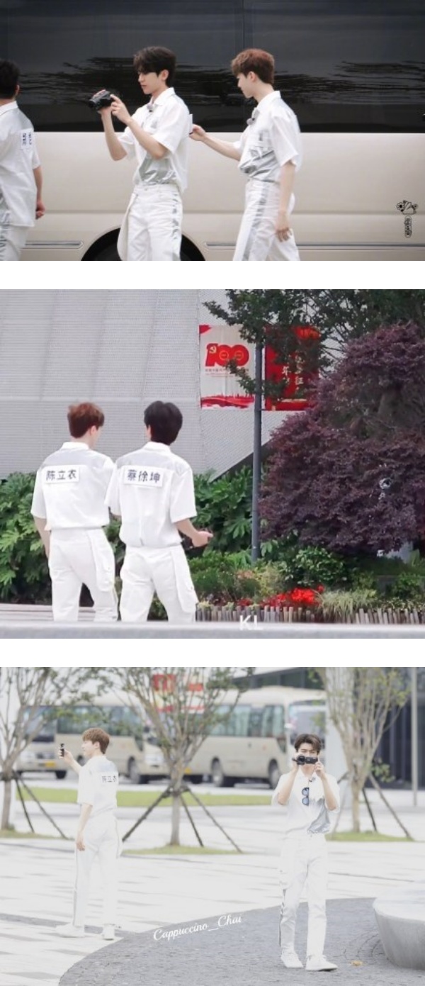 网友最期待的画面之一,莫过于他和蔡徐坤合体!两人被拍到不少并肩行走的照片,只见蔡徐坤拿着相机,而陈立农则伸手摆弄他背后的名牌。