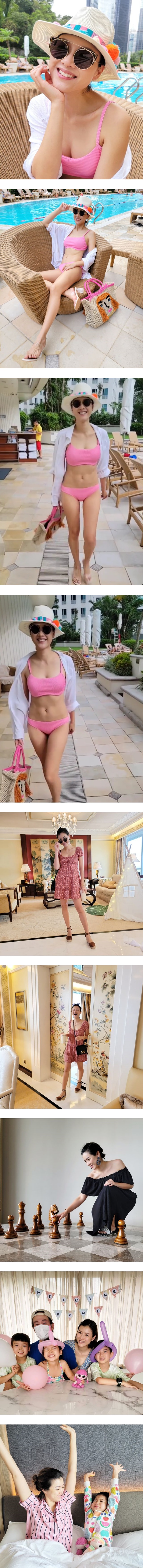 其中,陈茵媺换上粉红泳装,戴着帽子、墨镜在泳池旁摆pose、走catwalk。仔细看她这结实腹肌和好身材,完全看不出她已经生了三个娃。
