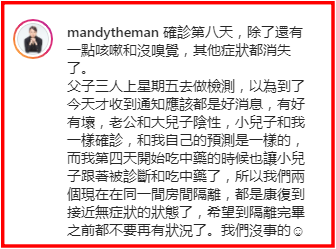 陈谕最后为自己和儿子打气:“希望到隔离完毕之前都不要再有状况了。我们没事的。”