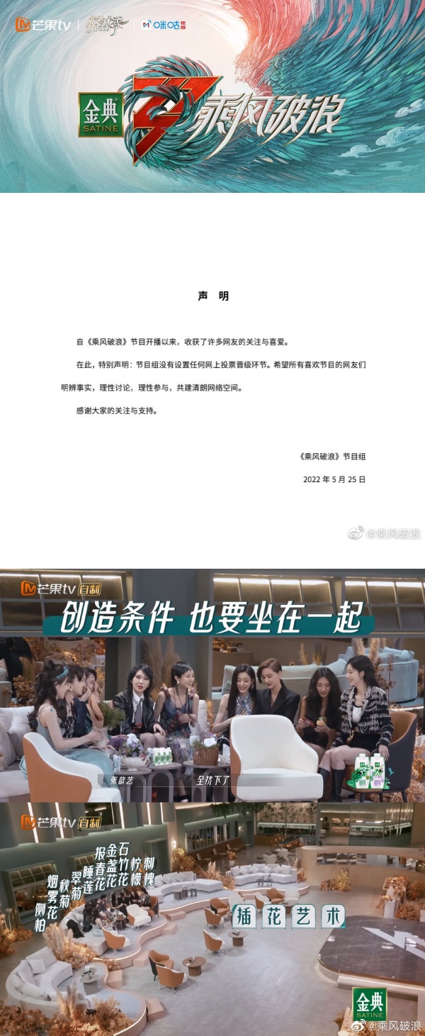 在《乘风破浪》官方微博发出的声明中提到,“节目组没有设置任何网上投票晋级环节。希望所有喜欢节目的网友们明辨事实,理性讨论,理性参与,共建清朗网络空间。”