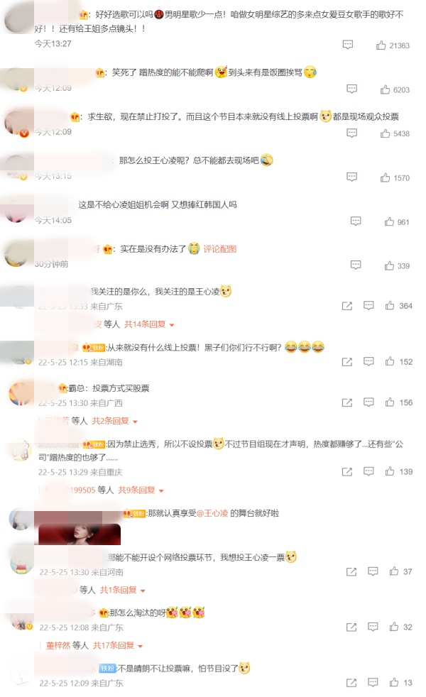 该声明曝光后,网友留言调侃称,“求生欲,现在禁止打投了”、“那怎么投王心凌呢?总不能都去现场吧”、“从来就没有什么线上投票!黑子们你们行不行啊”、“因为禁止选秀,所以不设投票”、“不是晴朗不让投票嘛,怕节目没了”等。