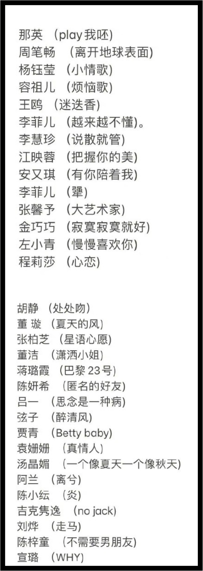 另外,不少姐姐所选择表演的歌曲是台湾名曲,包括周笔畅演唱五月天的《离开地球表面》;杨珏莹表演《小情歌》;王鸥表演《迷迭香》;张馨予选唱《大艺术家》;金巧巧演唱《寂寞寂寞就好》等。