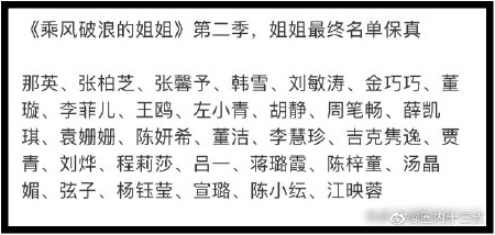 网传《乘风破浪的姐姐》第二季将在明天(20日)开始拍摄,早前就传出第二季的嘉宾阵容,包括:那英、张柏芝、张馨予、韩雪、刘敏涛、金巧巧、董璇、李菲儿、王鸥、左小青、胡静、周笔畅、薛凯琪、袁姗姗、陈妍希、董洁、李慧珍、吉克隽逸、贾青、刘烨、程莉莎、吕一、蒋璐霞、陈梓童、汤晶媚、弦子、杨钰莹、宣璐、陈小纭、江映蓉 。