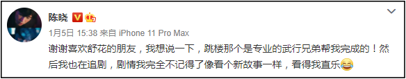 在这段幕后花絮疯传后,陈晓立刻发文回应,澄清:“我想说一下,跳楼那个是专业的武行兄弟帮我完成的!然后我也在追剧,剧情我完全不记得了像看个新故事一样,看得我直乐。”