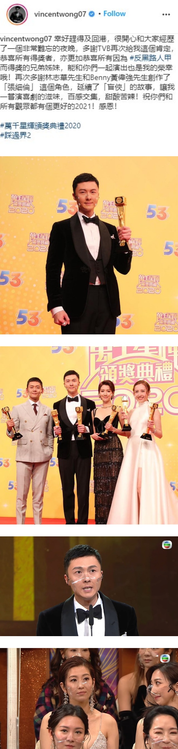 另外,王浩信也在IG访问,他提到幸好此次赶得及回港出席颁奖礼,和大伙儿一起经历了难忘的夜晚,“多谢TVB再次给我这个肯定,恭喜所有得奖者”,文末王浩信祝愿大伙儿有更美好的2021。