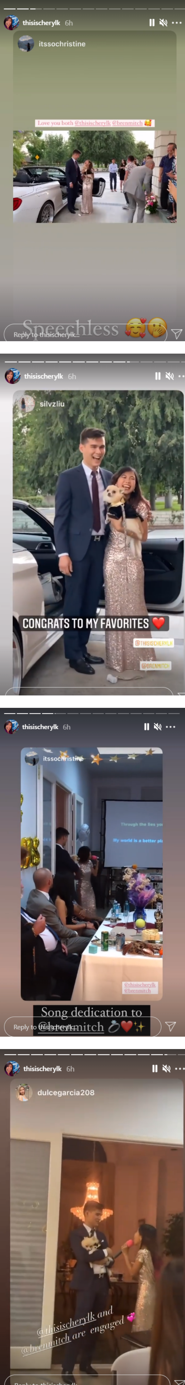 求婚后,男友开着开蓬跑车接她抵达订婚宴会,她手上还抱着爱犬。在宴会上,Cheryl K含情脉脉看着未婚夫,边演唱Celine Dion的经典歌曲《Because You Loved Me》,气氛相当甜蜜。