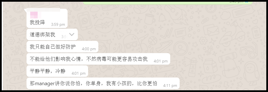 然后,对方就说了这么一句话:“你说你怕,你单身,我有小孩的,比你更怕。”