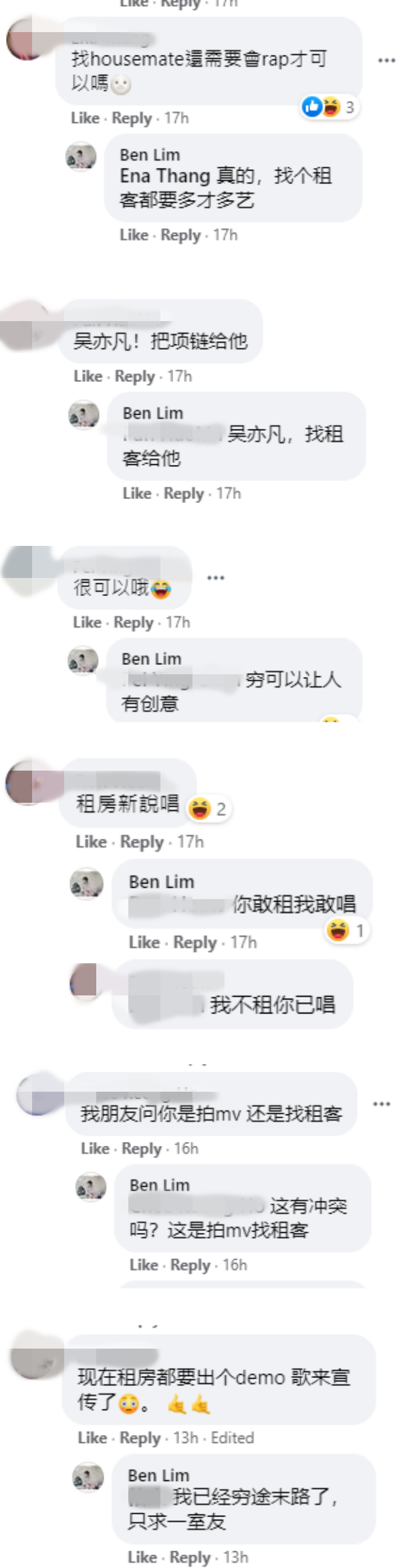 网友纷纷赞他非常有才,还CUE了《中国新说唱》导师吴亦凡:“吴亦凡!把项链给他”、“租房新说唱”,他本人也在留言处自我调侃:“找个租客都要多才多艺”、“穷可以让人有创意”。