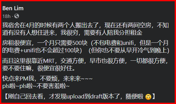 大马网友“Ben Lim”在22日上传一支1分钟视频,创意以歌曲方式召屋友!