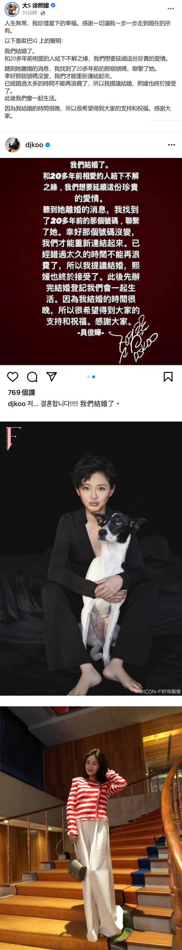 艺人大S(徐熙媛)在去年11月和汪小菲宣布离婚后,8日早她在Facebook上转发了具俊晔的声明,双方齐齐公布结婚的喜讯。