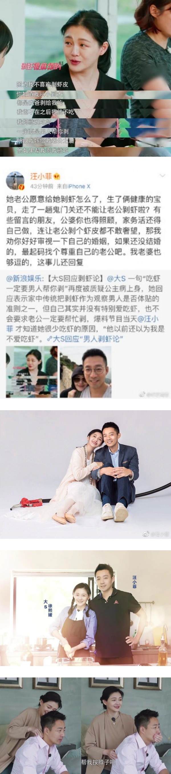 为此,汪小菲在微博上发文称,“她老公愿意给她剥虾怎么了”,他称太太为了自己生了两个健康的宝宝,到鬼门关走了一趟,难道最为老公的就不能帮她剥虾?文末,汪小菲还要网友好好审视自己的婚姻。