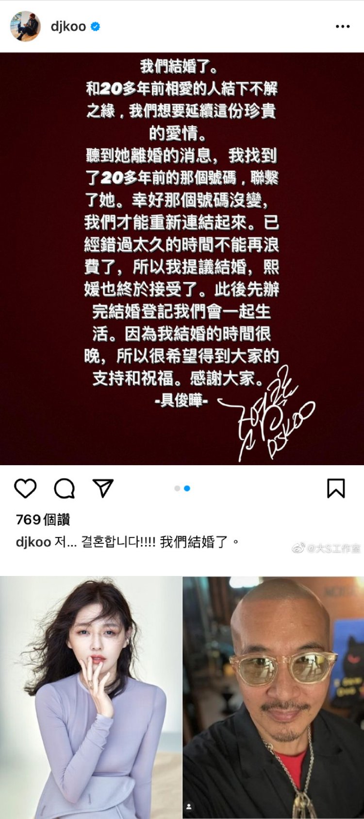 据台媒《苹果新闻网》报道,大S此次再婚原本并不想对外发声明,“因为我已经退出演艺圈,为什么要发声明”,但因尊重老公的决定,因此由“欧巴”先对外官宣,大S再跟着老公的行动。