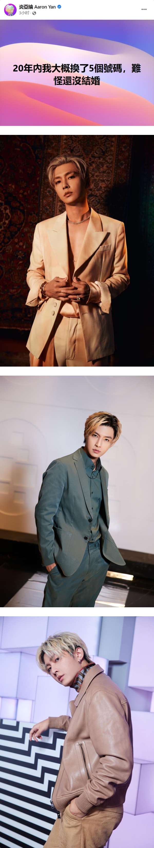 有趣的是,炎亚纶在Facebook上发文自揭,20年里自己换了5个手机号码,看了大S和具俊晔的重逢点滴,炎亚纶叹说,“难怪还没结婚”,炎亚纶也留言自嘲,多次换手机号码也是他至今继续浪的理由。