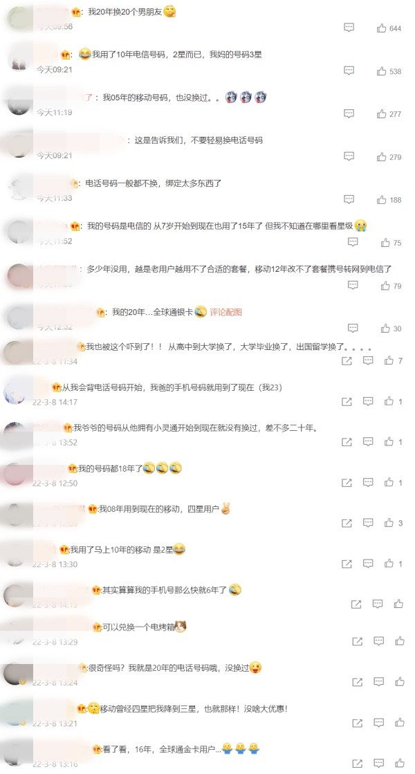 此外,微博上出现了“20年没换电话号码”话题掀起热议,“我20年换20个男朋友”、“这是告诉我们,不要轻易换电话号码”、“我也被这个吓到了!! 从高中到大学换了,大学毕业换了,出国留学换了”、“很奇怪吗?我就是20年的电话号码哦,没换过”等。