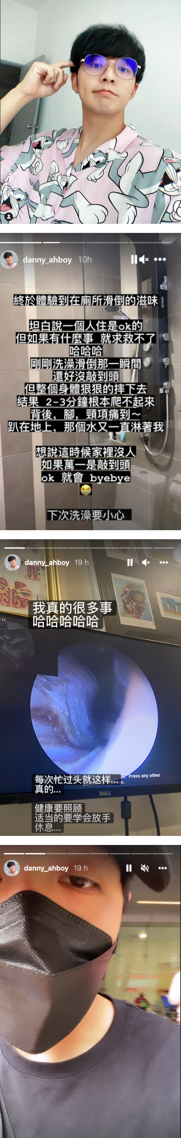其实7月份时独居的 Danny许佳麟曾经在厕所狠狠摔倒,倒地后一度爬不起来,更直言敲到头的话自己真的会跟大家告别了。怎料5日他再度调侃自己:“真的很多事”,表示自己因为忙过头没有适当的休息,“工作狂”的个性让他不会分辨休息时间,还常常熬夜,这次身体终于给自己警告了。