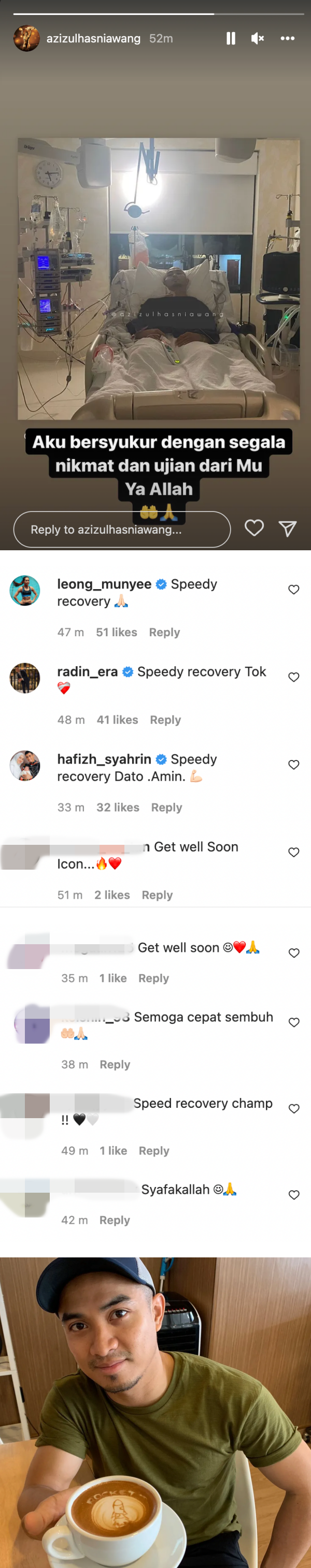 不过在开斋节的前一天,Dato Azizulhasni Awang的社交平台突然发出了一张他躺在病床上的照片,写下:“感恩上苍给我的测试和考验”,疑似是太太代为发文。