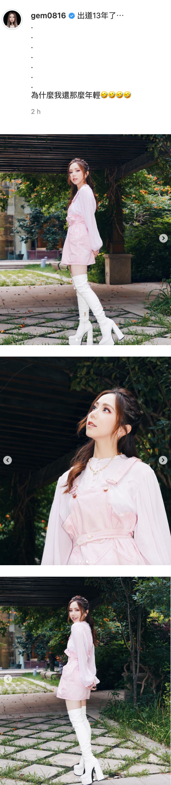 邓紫棋在今天(11日)中午时更是加码释出了一组以粉色的连身裙造型加上白色靴子的造型,调皮喊道:“为什么我还那么年轻”,让歌迷们纷纷留言:“你就算出道30年还是一样年轻”、“最年轻的艺术家”、“13年你的感叹只有自己为什么还是那么年轻吗?” 、“解解不老的超能力太强了” 等。