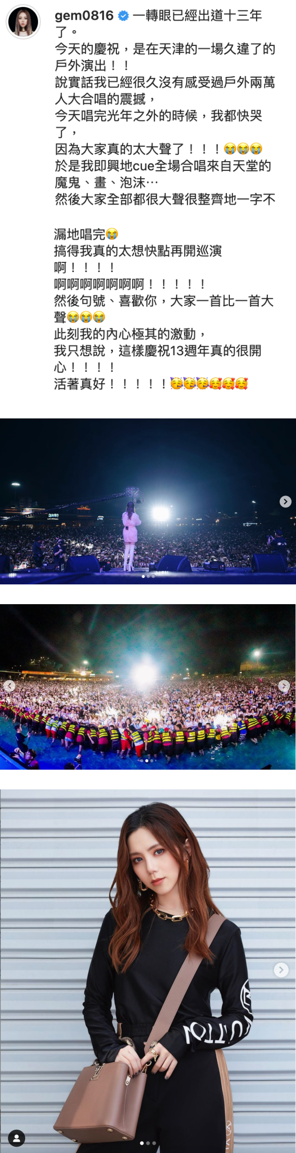 邓紫棋昨晚(10日)在天津开唱庆祝出道的13周年,她坦言:“这是一场久违了的户外演出,说实话我已经很久没有感受到两万人大合唱的震撼,今天在唱完《光年之外》的时候我都快哭了,因为大家真的太大声了!”。