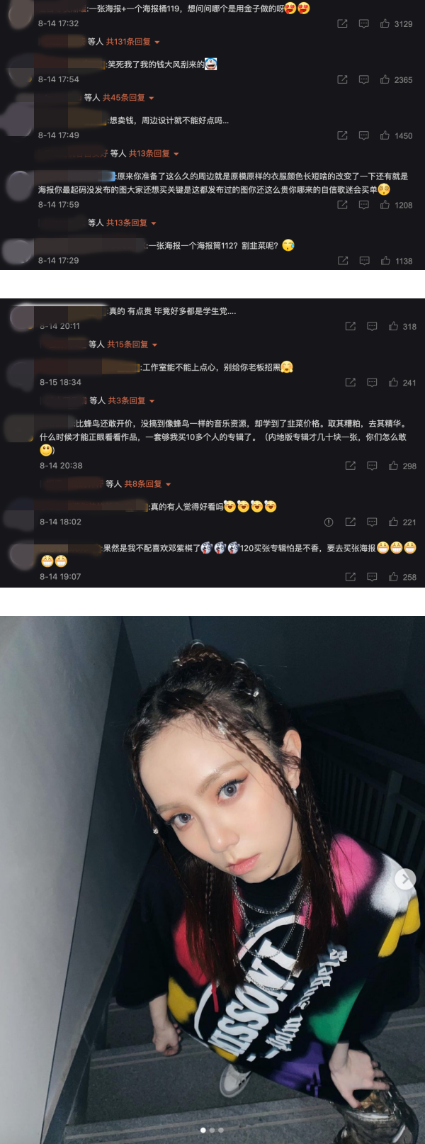 大部分的粉丝们都觉得难以接受,纷纷涌入工作室留言:“一张海报+一个海报桶119,想问问哪个是用金子做的呀”、“笑死我了我的钱大风刮来的”、“想卖钱,周边设计就不能好点吗”、“一张海报一个海报筒112?割韭菜呢”、“真的有点贵 ,毕竟好多都是学生党”、“果然是我不配喜欢邓紫棋了” 等。