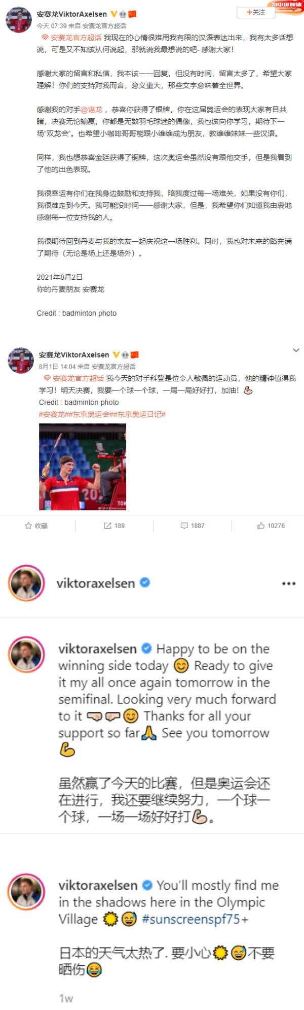 丹麦羽球男单安赛龙在2日晚的男单决赛中,以2比0(21-15、21-12)完胜中国卫冕冠军谌龙,完成从小就梦想的奥运会金牌目标。赛后,他特别以流利的中文录制了一段1分钟视频,感谢大家的支持。