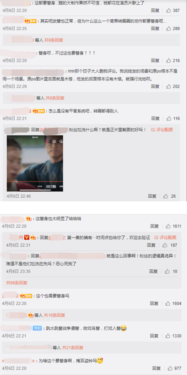 这幕穿帮镜头引来不少网友吐槽:“这替身也太明显了”、“这个也需要替身吗”、“跳水跳窗战争漫替,吻戏鸟替,打戏人替”、“其实吧武替也正常,但为什么这么一个简单转圈圈的动作都要替身呃”、“一个转身都需要替身”、“钱太好挣了”。