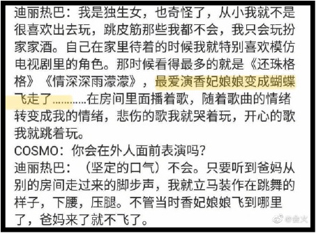 有网友挖出迪丽热巴以前受访时曾自曝,小时候喜欢玩扮家家酒,最爱表演《还珠格格》中香妃娘娘变成蝴蝶飞走的画面,因此她昨天cos蝴蝶的路透曝光后,让不少粉丝都笑说:“跑起来真的好像要变成蝴蝶飞走”、“这是迪丽热巴小时候的梦想,请他人不要阻拦”、“这个小步子笑死我了”。