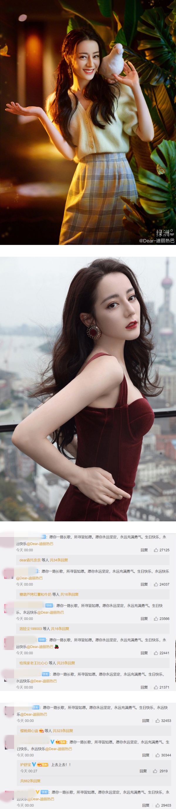 新疆美女迪丽热巴有着精致五官和好身材,3日是迪丽热巴的29岁生日,踏入00点大批粉丝留言为她送上祝福。