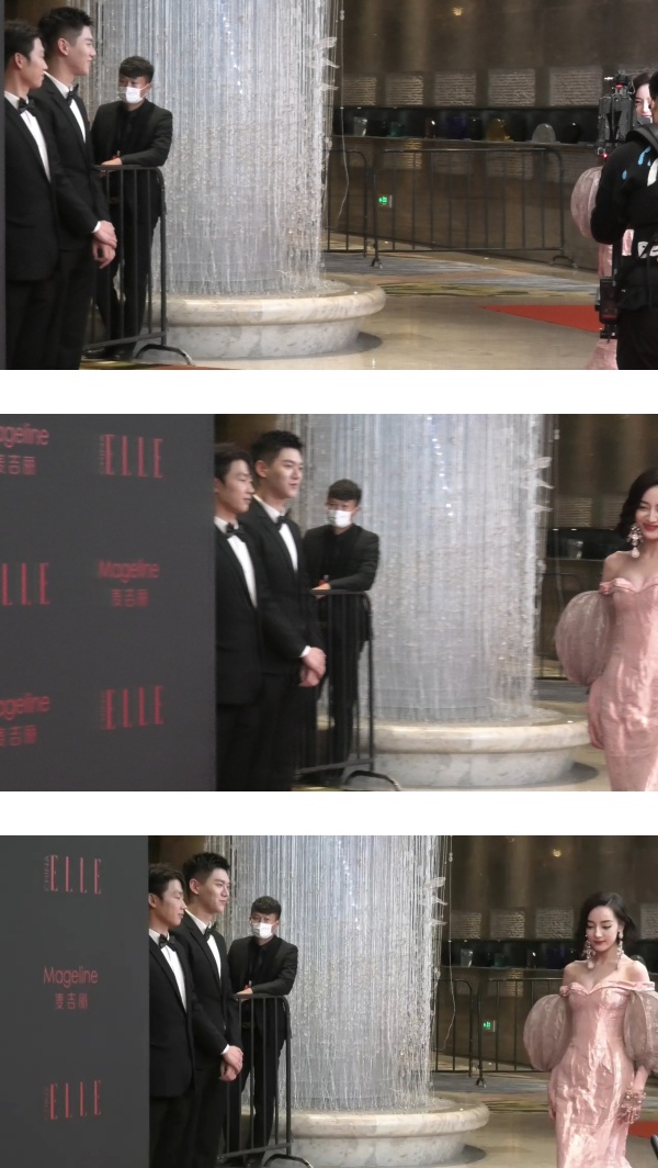从网上曝光的画面可见,在她亮相、走红地毯时,背景板站着的两位男性工作人员意外摄入镜头中。只见他们目不转睛地看着迪丽热巴,过程中嘴角更是忍不住上扬,完全是看到美女时超真实的反应!