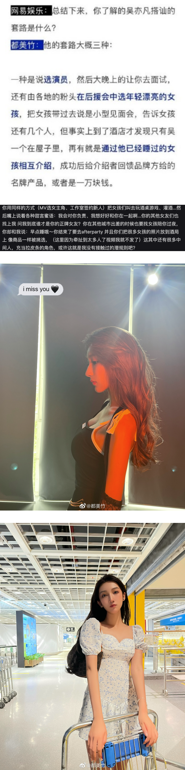 在6月2日时,有一名网友刘美丽发文指出都美竹遭到吴亦凡劈腿、冷暴力对待。7月8日,都美竹开始了自己对吴亦凡的爆料,指出她以“酒桌选妃”的方式以“MV 选女主角、工作室签约新人“ 的模式潜规则了许多未成年女孩。
