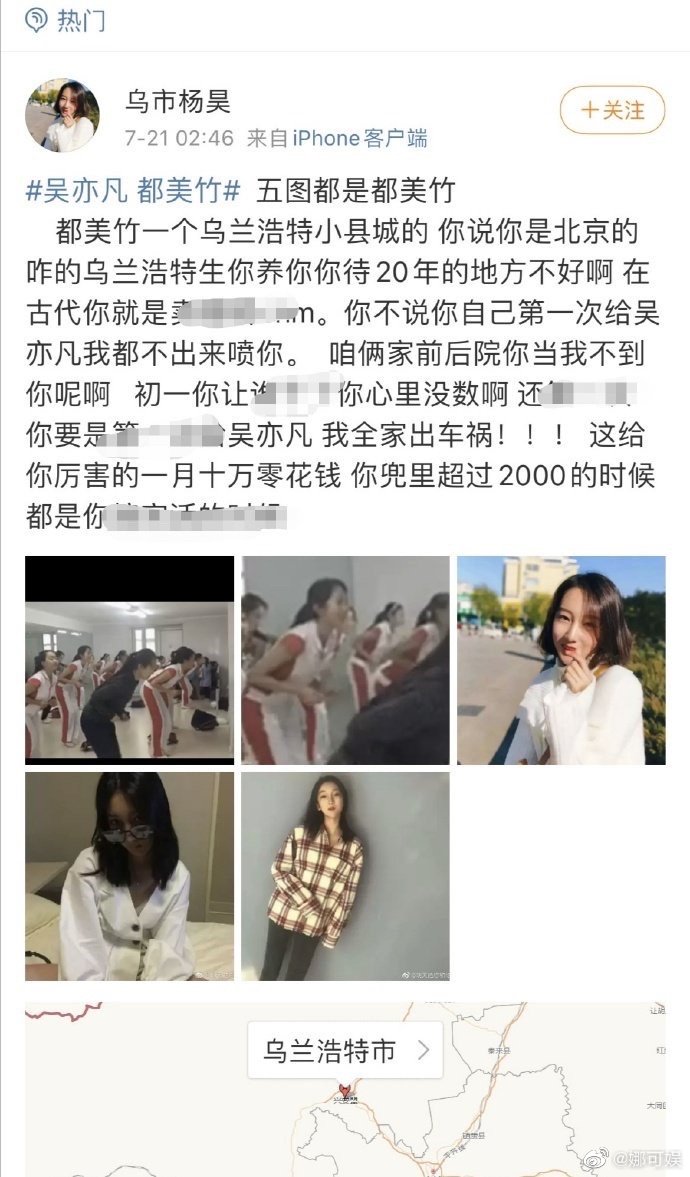 吴亦凡、都美竹事件闹得沸沸扬扬后,网友“乌市杨昊”21日发文,声称自己是都美竹的邻居,指都美竹的家乡是乌兰浩特而不是北京,批评她16岁就已失身,更爆料她是援交妹,意指她说谎成性,一度引起轩然大波。