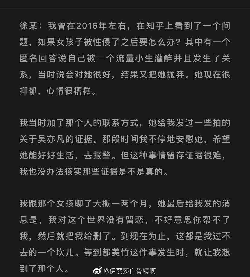 在警方发表通报后,写手徐姓男子接受某家中国媒体专访,透露自己曾在2016年遇到一名被流量小生灌醉并发生性关系的女生,“当时说会对她很好,结果又把她抛弃。她现在很抑郁,心情很糟糕”,后来该名女生发了不少吴亦凡的证据给他。