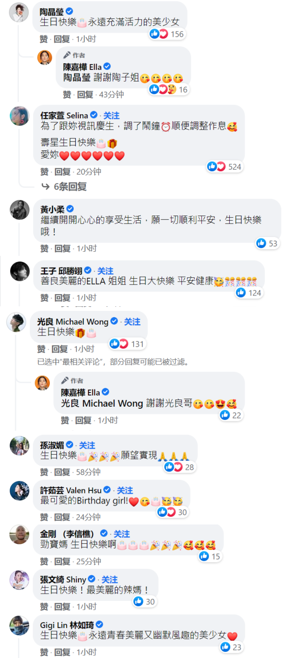 Ella庆生贴文曝光后,圈内的艺人好友、粉丝纷纷留言为她送上祝福,可见她人缘极好。