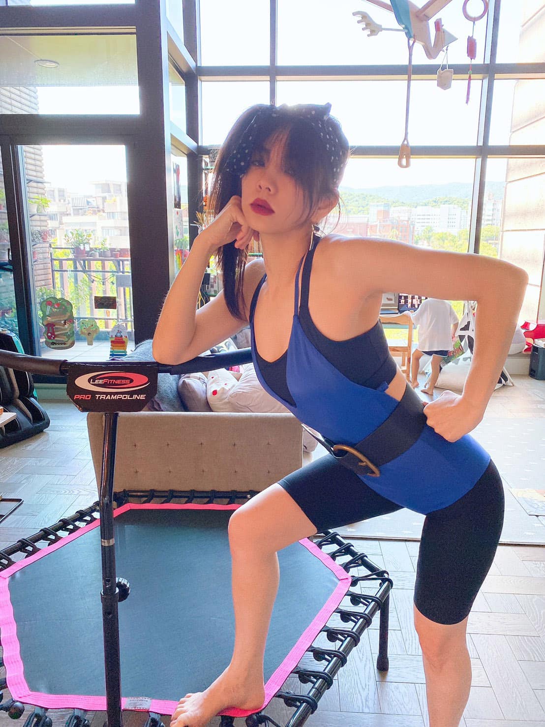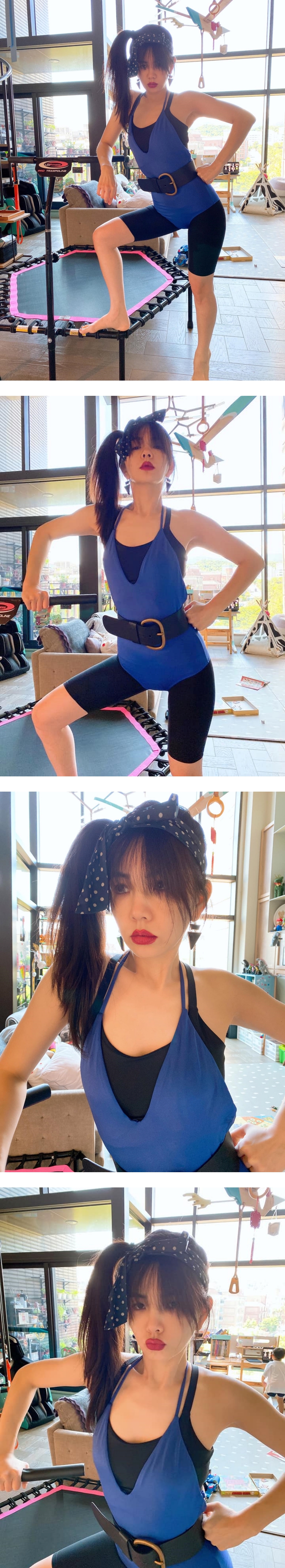 Ella 14日在FB晒出一组蹦床运动的影片及照片,只见她绑上高侧马尾,扎上发带、戴上夸张的大耳环,化上红唇,身上则穿着蓝色连体衣,运动装扮非常夸张,笑说:“今日跳床主题:‘玛丹娜’”。
