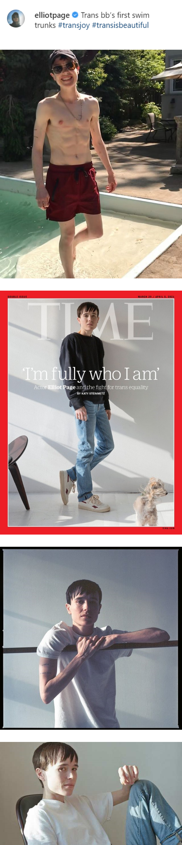 Elliot Page在贴文中提到,变性后换上的第一条泳裤,曝光照片中看到他赤裸上身,大方展示结实胸肌和冰格腹肌;照片曝光后立即引起网友关注有者直呼,“8 pack”、“看那开心的笑容”、“瞧有帅哥”、“以你为荣,这照片满满的欢乐”等。
