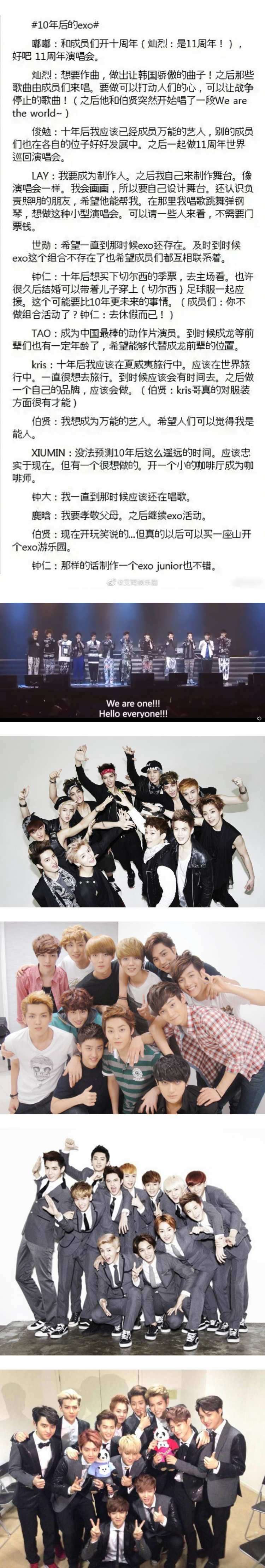 EXO出道10周年,除了在韩网掀起回忆杀外,在微博也同样拥有不少话题,有网友挖出他们刚出道时,提到“对10年后的憧憬”的片段,其中包括开周年演唱会、成为全能艺人、作曲、当制作人、成为动作片演员、继续EXO活动等。
