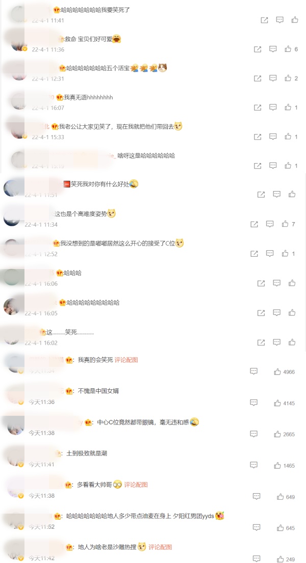网友看了喊话,“我真的会笑死”、“中心C位竟然都带眼镜,毫无违和感”、“土到极致就是潮”、“哈哈哈五个活宝”、“这也是个高难度姿势”等。