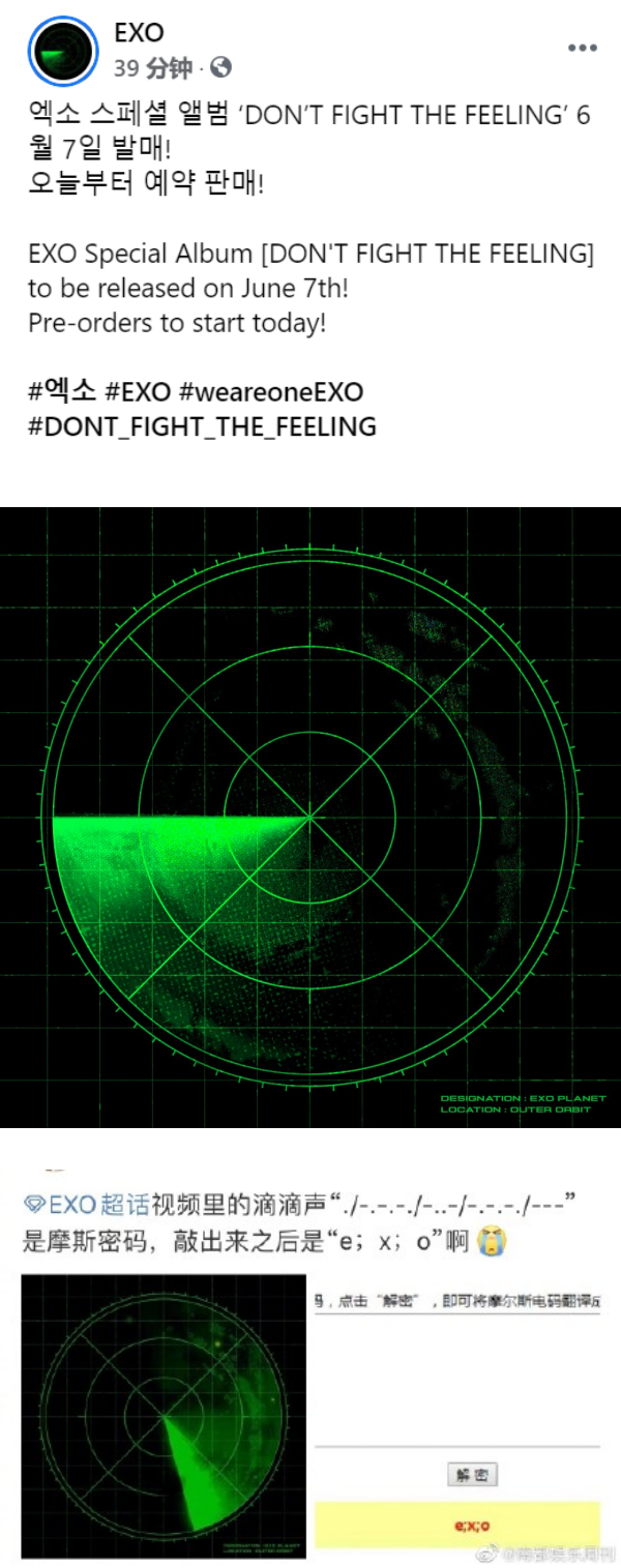 韩团EXO官方社交媒体在上发布了一段7秒钟的预告,同时宣布团体将推出迷你专辑《DON'T FIGHT THE FEELING》。