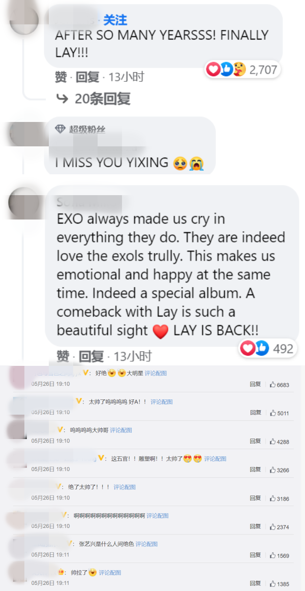 EXO的预告照曝光后,粉丝直呼,“隔了那么多年,终于啊LAY!!!”、“绝太帅了”、“爷青回!”、“张艺兴这脸,真的帅到过分了”等;等待了许久,爱丽们终于等到了张艺兴的回归,期待团体的新作呀!
